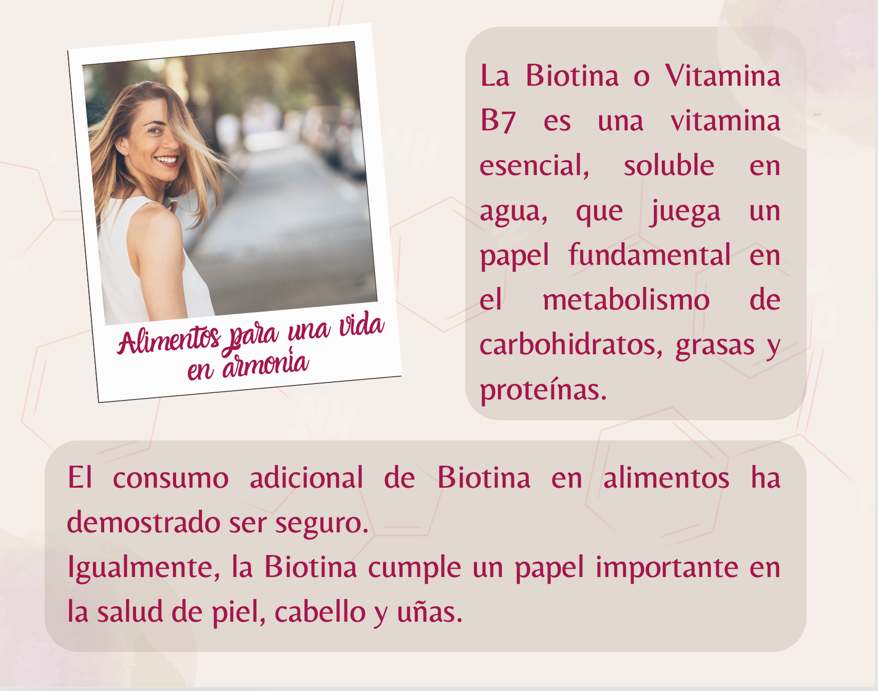 El consumo adicional de Biotina en alimentos ha demostrado ser seguro. Igualmente, la Biotina cumple un papel importante en la salud de piel, cabello y uñas.